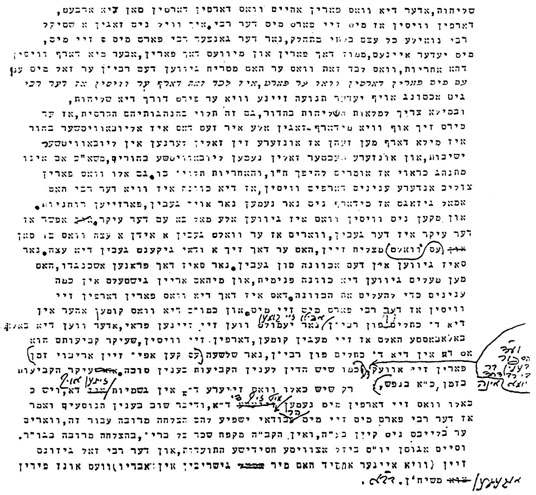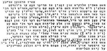 טפראדעג רע טאה רעירפ זא ןגאז ןוא םיקוליח ןכאמ סאוו עניוזא ןאראפ זיא'ס :'א םוליצ ףיוא ןפור טנעקעג םע טאה יבר רעד םוראוו ,טקישעג םע טאה'מ סאוו תוחילש יד ןגלאפ ריד ךאד באה ךיא ,טינ רימ וטסגלאפ סאווראפ ,רעה :ווירב א םע ןביירש רעדא ,תודיחי .ליוו רע סאוו ןאט ןיוש רע ןעק וישכע כ"אשמ .תוחכ ריד ןבעגעג ןוא תוחילש א ןיא טקישעג |